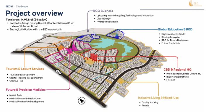 EEC เปิดผังเมืองใหม่น่าอยู่อัจฉริยะ พร้อมเปิดทางเอกชนร่วมลงทุน PPP กว่า 7.4 หมื่นล้านบาท ในปี69 พัฒนาพื้นที่ 5,795 ไร่ จากพื้นที่รวม 14,619 ไร่ ออกแบบแผนผังการใช้ประโยชน์พื้นที่แบบเชิงแนวคิด เพื่อพัฒนาเป็นย่านศูนย์กลางธุรกิจ สถานที่ราชการ ศูนย์การแพทย์