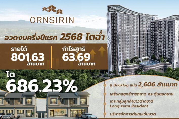 ORN-อรสิริน เชียงใหม่ เผยครึ่งปีแรก 2568 รายได้ 801.63 ล้านบาท กำไรสุทธิ 63.69 ล้านบาท โต 686.23% ไตรมาส 2/68 รายได้ 362.93 ล้านบาท กำไรสุทธิ 25.05 ล้านบาท จากยอดโอนที่อยู่อาศัยในเชียงใหม่ มั่นใจ Backlog 2,606 ล้านบาท หนุนรายได้ครึ่งปีหลัง