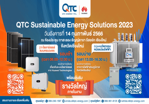 รู้จักนวัตกรรมที่ช่วยแก้ไขปัญหาด้านพลังงานอย่างยั่งยืนและเป็นมิตรต่อสิ่งแวดล้อม ด้วยเทคโนโลยีจากวิทยากรผู้เชี่ยวชาญมากประสบการณ์ ภายในงานสัมมนาหัวข้อ QTC Sustainable Energy Solutions 2023 วันอังคารที่ 14 กุมภาพันธ์ 2566 ณ ห้องประชุมกาสะลอง ธัญญ์ธารา รีสอร์ท เชียงใหม่ จังหวัดเชียงใหม่